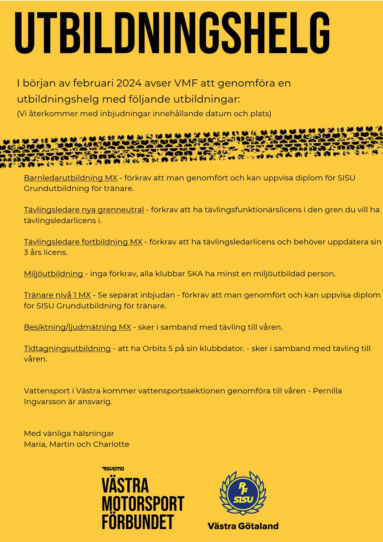 I början av februari 2024 avser VMF att genomföra en utbildningshelg med följande utbildningar: (Vi återkommer med inbjudningar innehållande datum och plats) - Vattensport i Västra kommer vattensportssektionen genomföra till våren - Pernilla Ingvarsson är ansvarig. - Tränare nivå 1 MX - Se inbjudan o länk längre ned - För krav att man genomfört och kan uppvisa diplom för SISU Grundutbildning för tränare. Med vänliga hälsningar Maria, Martin och Charlotte Utbildningskommién Västra Motorsport Förbundet